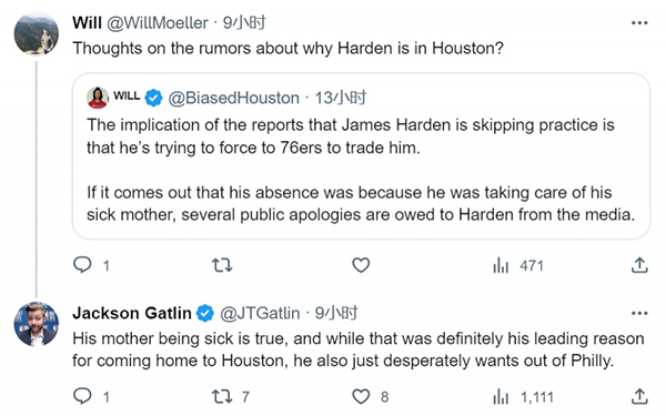 火箭记者Jackson Gatlin在推特上证明了此流言,他表示:他的妈妈生病了,这个消息是真的,并且这也是他离开球队回到休斯敦的首要原因,当然,他也是非常想要离开76人的。