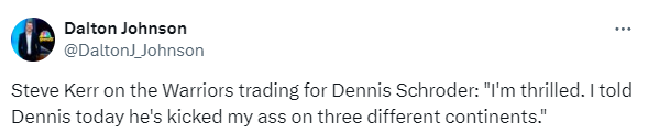 谈到勇士引援施罗德,勇士主帅科尔透露施罗德将于明天抵达湾区,施罗德将“无缝”地融入勇士队的进攻体系,因为勇士队需要施罗德的技能;科尔还表示,施罗德将在防守端提供帮助,在无球和挡拆方面都能提供很大的帮助。