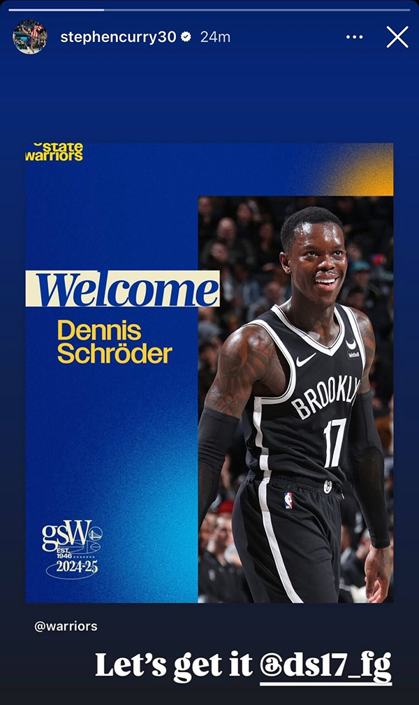 勇士官方连续发推欢迎施罗德来到湾区,库里更新社媒欢迎新队友施罗德:让我们开始吧。