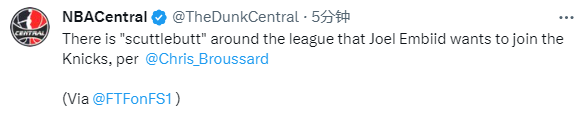 178直播10月20日,哈登离队闹剧仍在持续,难道恩比德也要走吗?名嘴Chris Broussard在节目中爆料,联盟中有小道消息称恩比德想要加盟尼克斯。