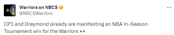 2023-24赛季,NBA联盟将在赛季期间举办锦标赛,勇士与国王、森林狼、雷霆和马刺被分在C组,锦标赛小组赛将于11月4日开始,小组第一可以直接晋级淘汰赛;保罗和追梦都相信勇士能够夺得NBA史上第一个锦标赛的冠军。