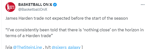 名记MarcStein报道,哈登在新赛季开始前不会被交易,他将会出现在常规赛揭幕战的大名单上,该记者表示:我一直被告知,在关于哈登的交易方面,没有任何进一步的事情发生。到目前为止,任何快船想拉第三方球队介入并为76人提供首轮签的想法都没能奏效。