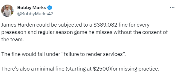 薪资专家Bobby Marks跟进报道,在未经球队许可的情况下,哈登每缺席一场比赛(包括季前赛)就会被罚款38万9082美元(约39万美元),该罚款属于“未能提供服务”类罚款。此外,缺席训练也会被处以至少2500美元的罚款。