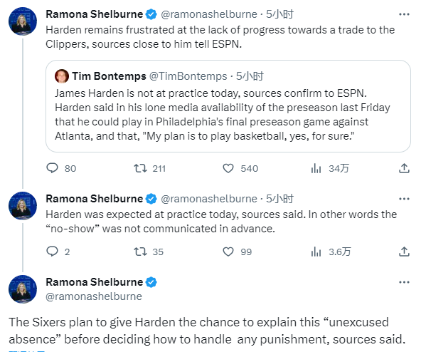 ESPN名记Ramona Shelburne报道,哈登周末在纽约与76人参加了NBA会议,但过去的这几天他一直在休斯敦。76人计划给哈登一次机会来解释一下为何“无故缺席”,然后再决定如何对他进行处罚。