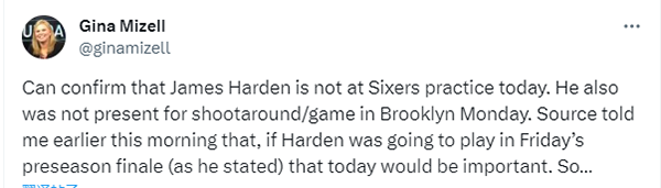 76人记者Gina Mizell表示:我可以确认哈登今天没有参加76人的训练。他也缺席了昨天在布鲁克林的训练和比赛。消息人士今天早些时候告诉我,如果哈登要参加周六季前赛的最后一场比赛(正如哈登亲承),那么今天将是重要的一天。所以......