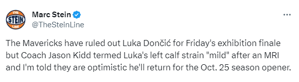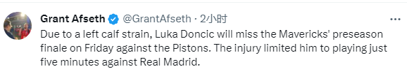 独行侠方面已确认东契奇将会缺席最后一场季前赛。名记MarcStein表示,有人告诉他,独行侠乐观地认为东契奇将会在10月26日的揭幕战(客场对阵马刺)复出。