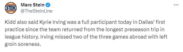 由于腹股沟疼痛,欧文连续缺席了2场季前赛,仍在接受治疗,不过基德透露,欧文今天完整参加了独行侠从海外季前赛之旅回归后的第一次训练。