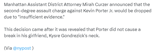 9月16日,美媒报道小波特求曼哈顿检方撤销对他的二级袭击指控,因为小波特的辩护团队称,小波特女友颈椎骨折是先天性缺陷,并非家暴导致的。