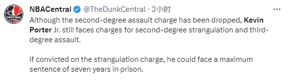 178直播10月17日,火箭新星小凯文-波特家暴女友案件的开庭审理结果曝光,据美媒《纽约时报》报道,小波特拒绝认罪,由于证据不足,小波特的二级伤害罪指控被撤销,不过小波特仍面临“勒颈”和“三级伤害罪”两项指控,罪名成立的话最高被判7年监禁。