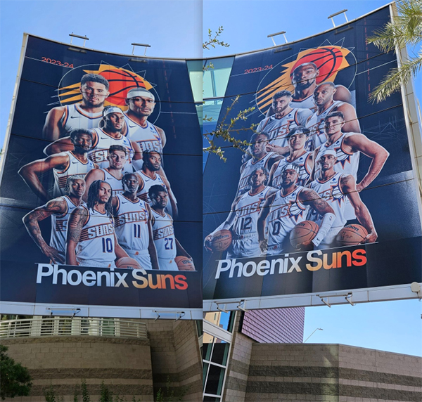 太阳队全新的巨幅海报出炉,海报位于太阳主场足迹中心球馆的外墙上,杜兰特领衔9人站在一侧,布克和比尔领衔另外10人站在另一侧,太阳队内的19名球员全都在海报上。