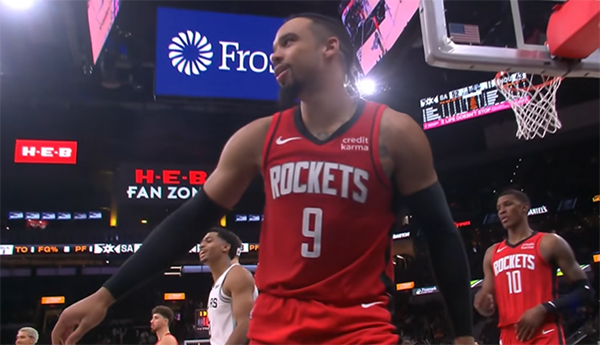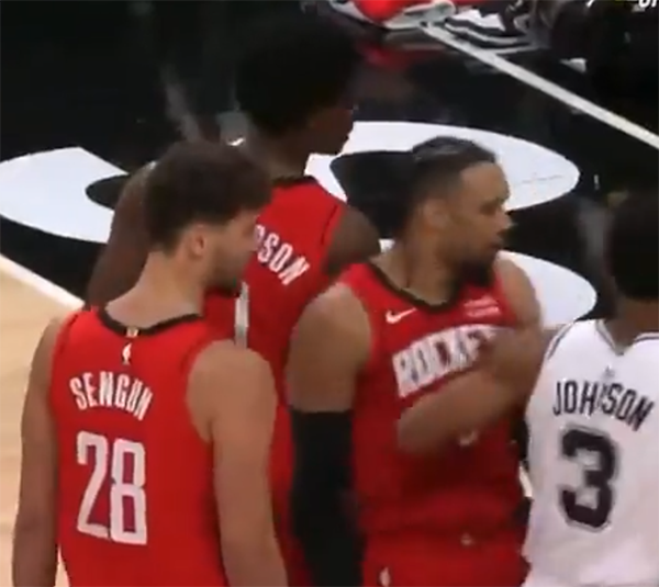在火箭和马刺比赛中,第二节9分多钟,阿门-汤普森犯规后和索汉纠缠在一起,索汉夹住汤普森的手臂,后者推了索汉一把,两人有点小摩擦,见状,马刺和火箭其他球员都围过来,其中科林斯和狄龙相互推搡导致现场气氛充满火药味,最终他们两人各自吃到一个技术犯规,马刺新星约翰逊肘击狄龙逃过一劫。