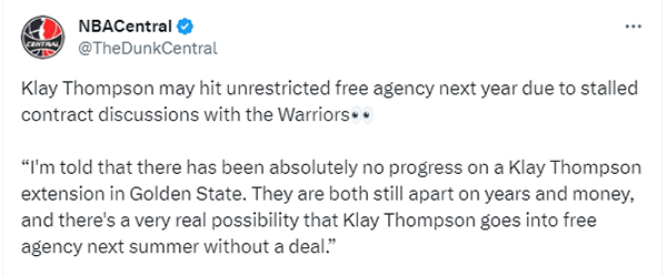 woj在节目中表示:我被告知,目前克莱-汤普森与勇士的续约谈判毫无任何进展,双方在续约合同的年限和薪金方面存在分歧。若双方没有提前续约,克莱明夏真的可能进入自由球员市场。