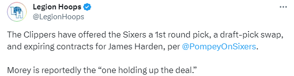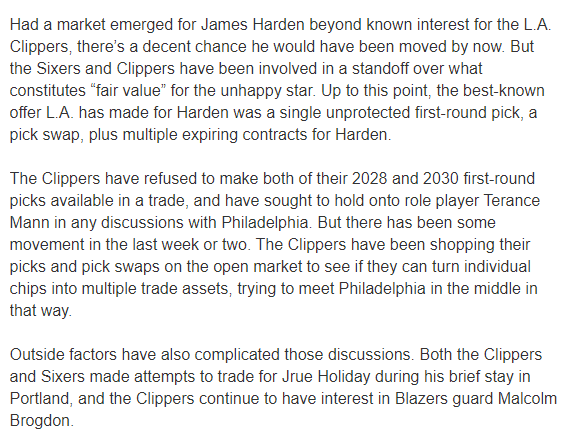76人记者Keith Pompey撰文报道,哈登不想要戏剧性的事情,他只是想要摆脱无法挽回的局面,快船希望尽快完成交易,他们为哈登报价一个首轮选秀权、选秀权互换和到期合同,作为唯一一支追求他的球队,他们不想提高报价,他么也觉得没有必要这样做。