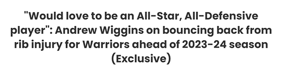 对于勇士新赛季的期待?维金斯表示:与球队建立联系,度过一个坚实而强大的赛季,我很想成为全明星,我很乐意进入最佳防守阵容,我们必须赢得比赛并且保持稳定。