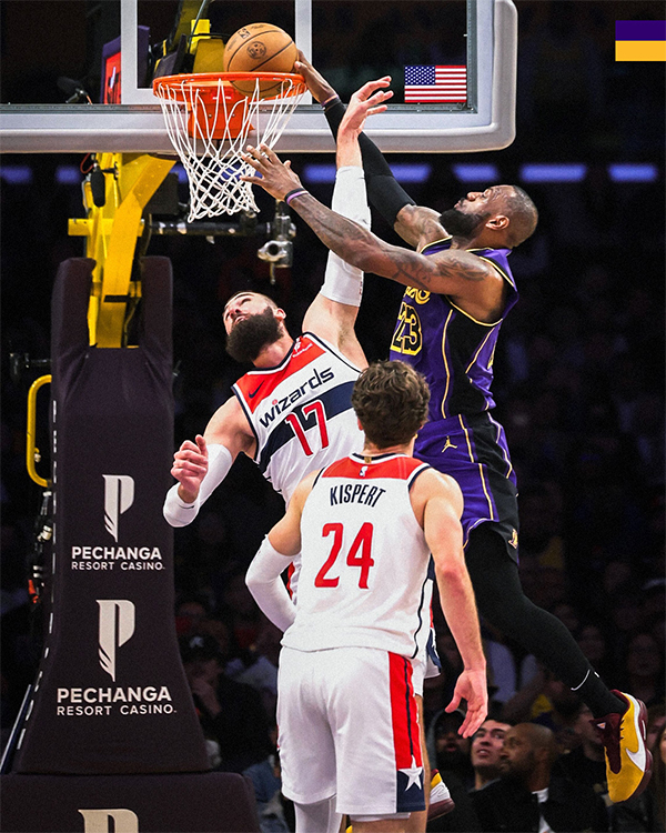 第二节詹姆斯的三分终于开张,带领湖人占上风,面对奇才的反扑,詹姆斯中投得分,空切隔扣瓦兰丘纳斯,打成不讲理隔扣2+1,老詹站在原地抖肩庆祝,湖人替补席沸腾,布朗尼双手抱头一副不敢信的表情;老詹连续得分带队重新拉开分差,半场打完湖人59-49领先10分。