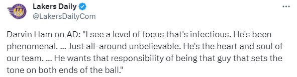 对阵雄鹿赛后,湖人主帅哈姆盛赞浓眉,表示:我看到他身上有非常高度的专注力,而且这种专注力具有感染力。他一直表现得非常出色,他是我们球队的核心和灵魂,他希望成为那个能在攻防两端影响比赛的人。