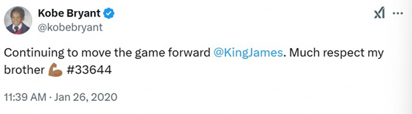 5年前的今天,詹姆斯生涯常规赛总得分超越科比;随后,科比更推祝贺詹姆斯,他写道:勒布朗-詹姆斯,继续前进,对我的兄弟充满敬意。