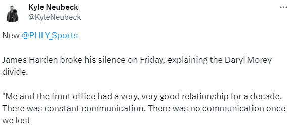 在谈到目前与球队之间的情况时,哈登说道:“当初我被交易到这里时,我一心只想以76人球员的身份退役。我本想留在这里并以76人球员身份退役。而管理层的未来计划里,没有这一点。但他在这方面非常非常擅长。