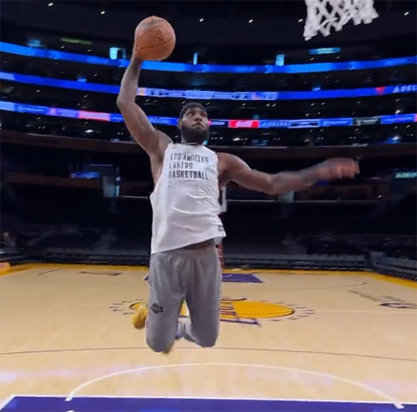 距离比赛开打还有3个多小时,詹姆斯就早早来到湖人球馆,身穿湖人训练背心和助教一起备战勇士,期间詹姆斯背后运球后起飞暴扣,转身突破潇洒拉杆上篮,底线突破后转身扣篮、背打后仰跳投以及加练三分球,各种操作应接不暇,38岁老詹的身体状态很好。