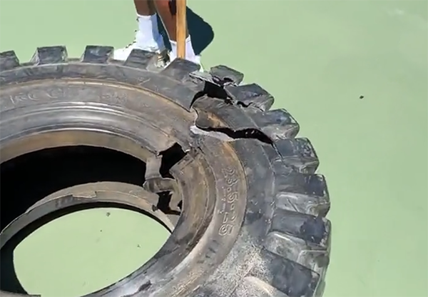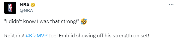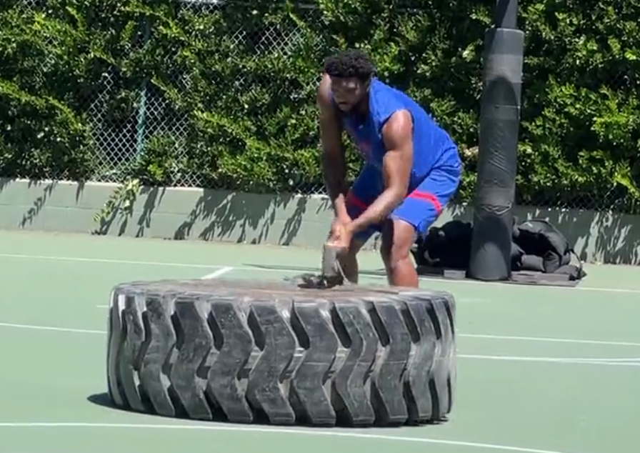 NBA官方晒出恩比德在球场上展示超强力量的视频,恩比德身穿76人训练服,双手握捶猛砸轮胎,第二锤就砸烂了轮胎,继续挥捶猛砸;恩比德直言:我不知道我的力量这么大。