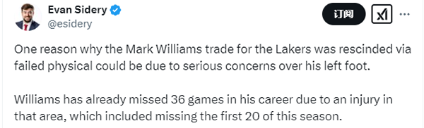 Evan Sidery进一步报道,马威与湖人队的交易因体检不合格被取消的一个原因是,湖人对他左脚伤病史的严重担忧,马威生涯因该伤病已经缺席了36场,包括本赛季的前20场比赛。