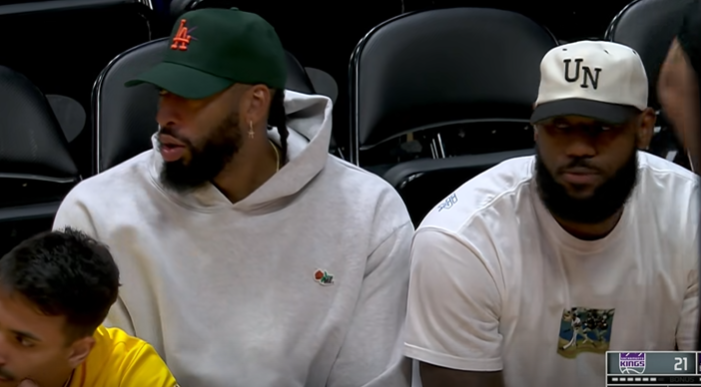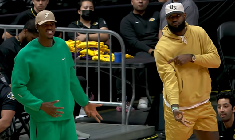 詹姆斯和浓眉两大巨星都戴着棒球帽以及身穿连帽卫衣坐在场边观战,第一节8分多钟,镜头拍到詹姆斯坐在场边大口喝橙汁,十分惬意;上半场最后阶段,福克斯罚球时,詹姆斯、浓眉和范德彪三人站在场边开心闲聊,三人身穿三个颜色,十分抢镜。