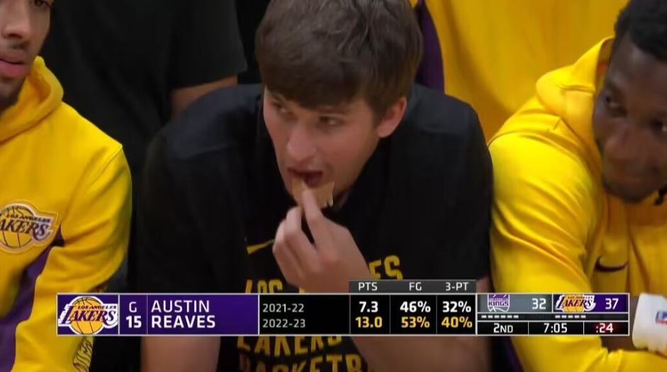 湖人另一巨头里夫斯也缺席比赛,即使休战也是身穿湖人训练服,可能是参加热身训练太累了,镜头拍到里夫斯坐在替补席大口吃饼干补充体力。