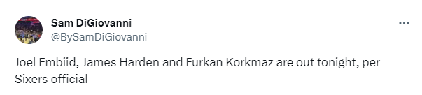 在新赛季季前赛揭幕战,哈登和恩比德都缺战客场对阵凯尔特人的比赛,如今回到主场迎战绿军,哈登和恩比德继续休战,科尔克马兹也缺席比赛。