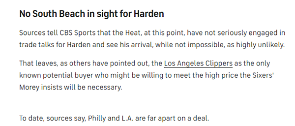 难道哈登真要被交易了吗?据CBS记者Bill Reiter报道,热火目前还没有认真地参与到哈登的交易谈判中,他们认为得到哈登虽并非不可能,但可能性很小。快船目前是已知唯一的哈登潜在下家,快船可能愿意接受76人高层所坚持的高价。不过到目前为止,76人与快船在交易上分歧很大。