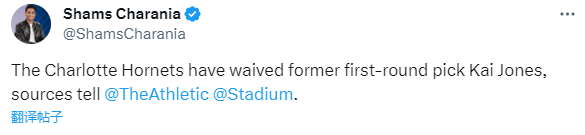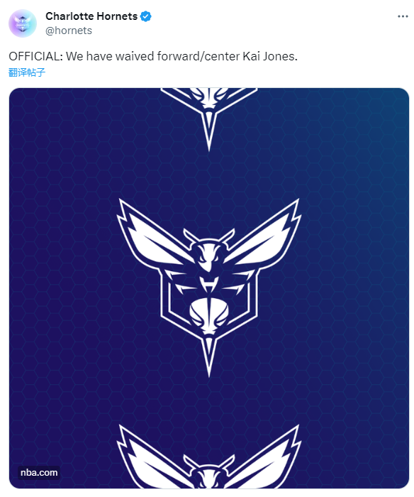 178直播10月12日讯 ,据名记shams报道,黄蜂已经已经裁掉了他们的首轮秀球员凯-琼斯;之后黄蜂官宣裁掉琼斯;今夏22岁的琼斯经常发表一些疯狂的言论,曾狂言他能打爆巅峰期的乔丹、詹姆斯和奥尼尔,嘲讽以及贬低队友,还宣布他已经申请离队。
