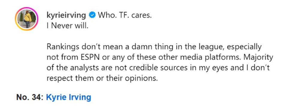 独行侠球星欧文的最新排名掉到第34位,上赛季排在第27位,排名下滑7名,欧文更新社媒爆粗回应此事,写道:谁TMD的在乎这个,我永远不会。排名在联盟中毫无意义,尤其是来自ESPN或任何其他媒体。在我眼中,大多数分析师都不是可靠的,我不会尊重他们和他们的观点。