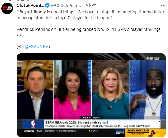热火球星巴特勒最新排名升到第12位,上赛季排在第17位,对此名嘴帕金斯在节目中为巴特勒鸣不平,他表示:季后赛巴特勒是真实存在的,我们必须停止不尊重巴特勒,在我看来,他是联盟前十的球员。