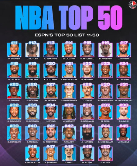 值得一提的是,哈登排名下滑更加严重,从上赛季第11名直接掉到第43名,排名暴跌32名。