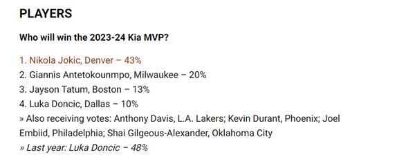1、约基奇43%;2、字母哥20%;3、塔图姆13%;4、东契奇10%;其他获得投票的球星有浓眉、杜兰特、恩比德和雷霆队亚历山大;上赛季东契奇获48%选票排名第一。