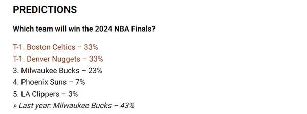 1、凯尔特人和掘金33%;3、雄鹿23%;4、太阳7%;5、快船5%;上赛季雄鹿获得43%的夺冠支持率,可最终他们在首轮惨遭黑八被热火淘汰出局。
