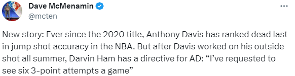 178直播10月11日讯 ,据名记Dave McMenamin报道,自从2020 年夺冠以来,安东尼-戴维斯的跳投命中率在 NBA中排名垫底;不过经常今夏苦练三分投篮后,湖人主帅哈姆对浓眉提出要求,要求浓眉每场比赛都出手6次三分球。