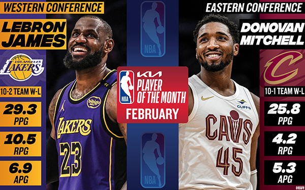 178直播讯北京时间2025年3月5日,NBA官方公布了2月份的最佳奖项。湖人队的勒布朗·詹姆斯当选西部月最佳球员,这是他职业生涯第41次获得这一荣誉,刷新了NBA历史纪录。同时,骑士队的双星多诺万·米切尔和埃文·莫布里也分别荣获东部月最佳球员和东部月最佳防守球员。