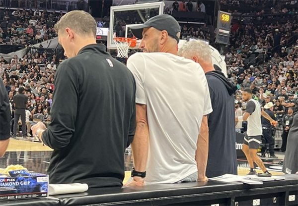 文班亚马身穿马刺黑色训练球衣亮相,从球员通道走进球场时,全场球迷为他起立欢呼,不愧为圣城新宠;热身时,2米26的文班亚马秀了一把胯下换手扣篮,马刺名宿吉诺比利站在场边观战。