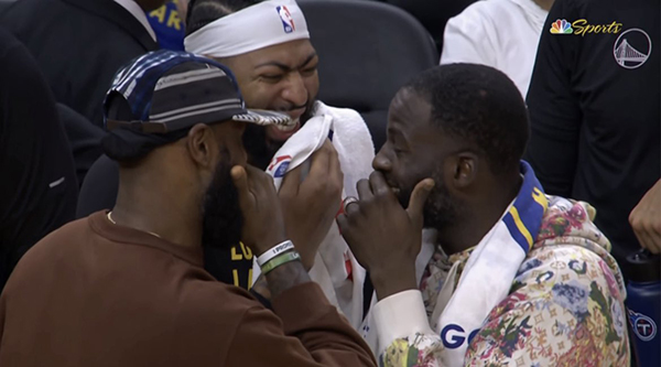 中场休息时,镜头拍到詹姆斯、浓眉和追梦格林围在一起开怀热聊,三人都捂着嘴畅聊,生怕说的话被别人看出来了,聊着聊着都咧嘴大笑,他们聊得太开心了。