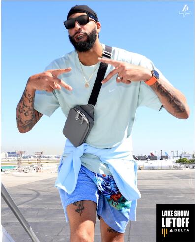 浓眉戴着墨镜、斜跨小包包并且把衣服绑在腰上,冲着镜头比手势,面部表情相当霸气;预计浓眉将出战与勇士的季前赛,新赛季,浓眉的目标是打满82场并且带队夺冠。