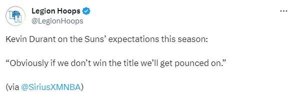 在节目中谈到了新赛季外界对太阳的期待,杜兰特表示:毫无疑问,我总是觉得我们每场都应该赢下,总冠军一直都是目标。但我们如何磨合,以及磨合得多快才是最重要的事情。我们会拭目以待,显然,如果我们没能夺冠,我们就会被喷的。但作为球员个体来说,我们总是期待尽自己能变得更好。