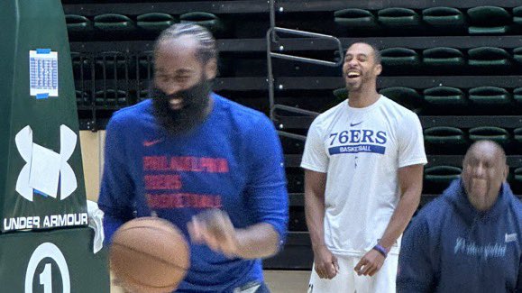 哈登与马克西一起进行训练,哈登突破上篮后跑到外线远投三分,马克西跟着做同样的动作;哈登与恩比德、哈里斯、塔克一起进行全场配合训练;76人官方晒出一张合影,哈登咧嘴大笑,马克西、丹尼-格林等人大笑,班巴蹲在最前面,塔克保守手臂十分抢镜。