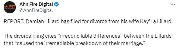 据悉,利拉德申请离婚的相关文件中写道,双方产生了“不可调和的分歧”,导致了双方婚姻关系“不可避免的破裂”。文件内容显示,利拉德的妻子从去年12月份起就与利拉德分居,两人分别居住在价值270万和770万美元的不同寓所中。