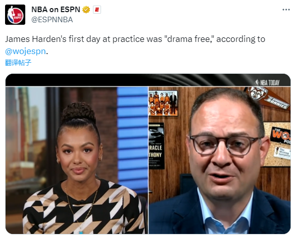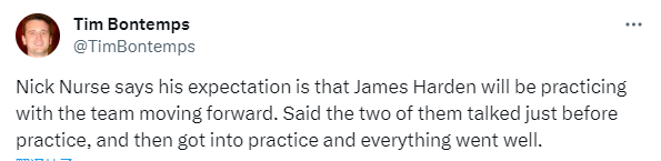 名记Woj报道,哈登今日完成了大部分训练科目,且没有在训练场上有任何不恰当的行为和言论,一切都非常和谐。