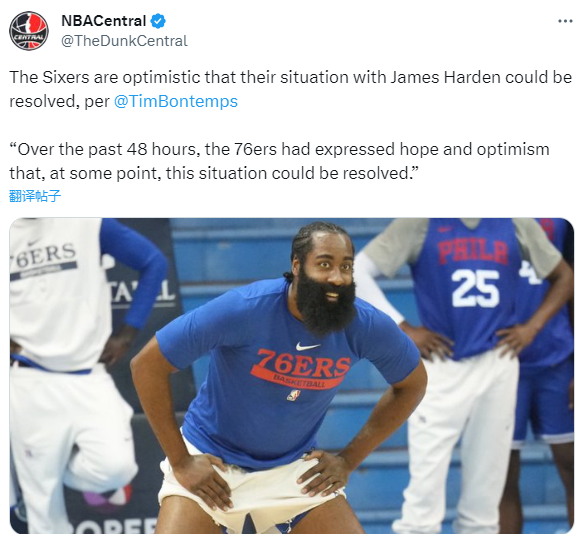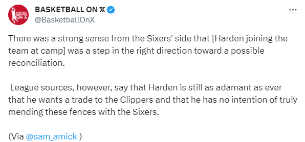 据报道,76人队乐观地认为他们与哈登之间的问题可以解决,SamAmick报道,76人方面有一种强烈的感觉,哈登加入训练营是双方迈向和解的一步;然而,消息人士透露,哈登仍然坚定地表示他想被交易至快船,并且他无意修复与76人的关系。