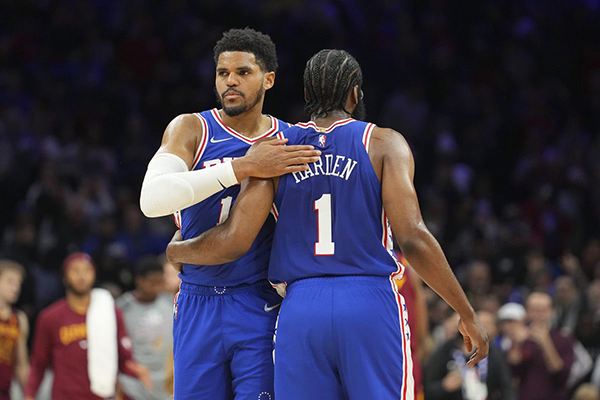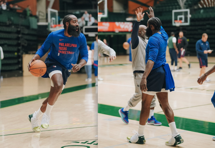 76人官方晒出哈登运球突破和与人击掌的画面,还晒出哈登与队友合练的画面——哈登持球组织进攻,哈里斯佯攻把球传给塔克,哈登接球后恩比德上前挡拆,哈登顺势突破并且助攻埋伏在底角的哈里斯,哈里斯命中三分球。