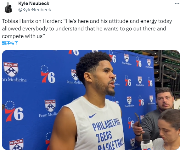 “哈登今天就在这里,他的态度和展示出的能量表明了态度,他想出场与我们一起去和对手竞争。在我看来,其他事情都不重要,他展示出了想和队友一起努力的能量。反正大家都知道现在的情况,我们只是想作为一个整体前进,并把事情理清。