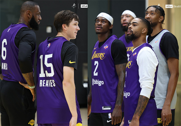 湖人官方晒出首日训练营的现场照,詹姆斯、里夫斯、浓眉、拉塞尔和范德比尔特都身穿湖人紫色球衣,他们就是湖人队在首日训练营对抗赛中的首发五虎,八村垒、伍德、文森特等人替补。