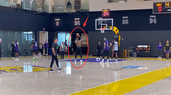 湖人记者曝光一些现场画面,湖人全队被分在不同的半场进行训练,詹姆斯、浓眉和八村垒一起加练罚球,即将39岁的詹姆斯赤膊出镜,好像是全场唯一一位赤膊训练的球员,有趣的是,湖人总经理佩林卡在球场上双手抄兜溜达。