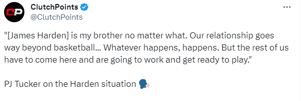 PJ-塔克表示:哈登是我的兄弟,我们的关系远远超越了篮球,但现在发生的事情就是这样的。